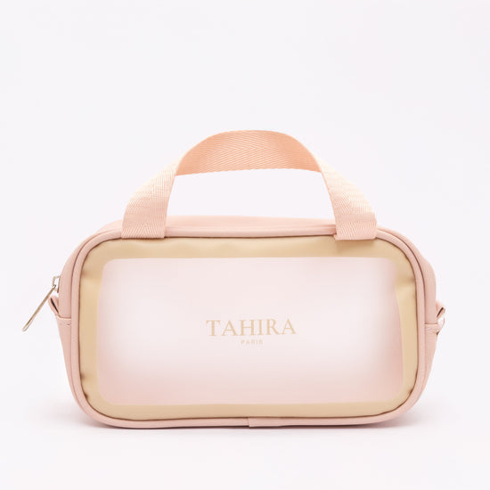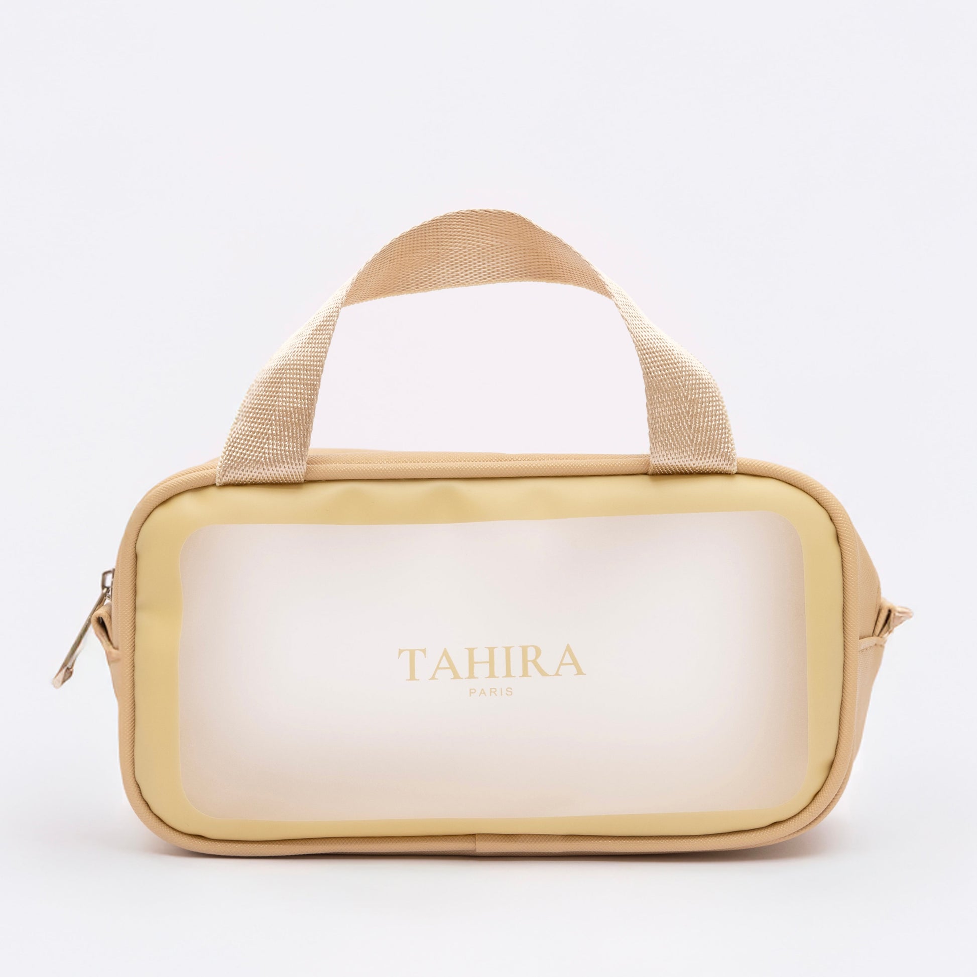La trousse Signature de TAHIRA PARIS pratique et élégante est conçue pour organiser vos indispensables de manière optimale. Fabriquée avec un tissu résistant et moderne, elle présente une face transparente givrée, une fermeture zippée sécurisée et des lanières sur le dessus, permettant de la suspendre ou de la transporter facilement.